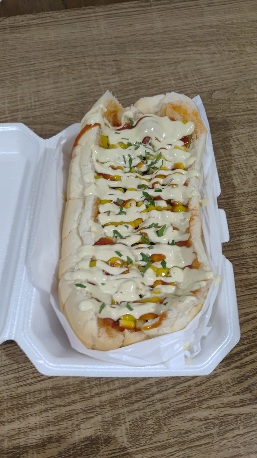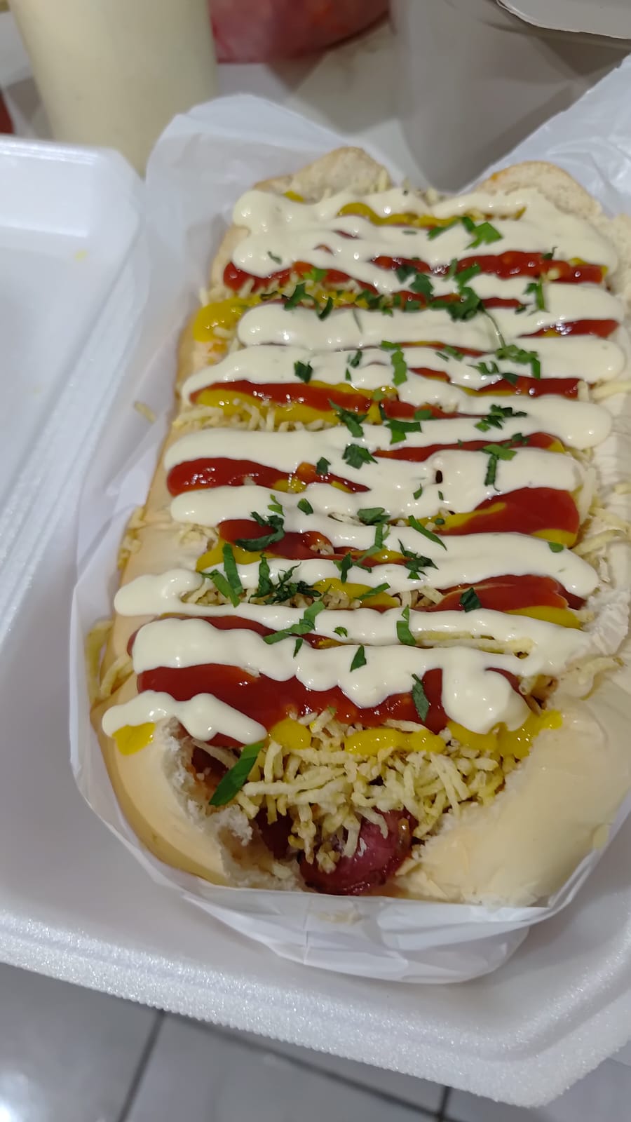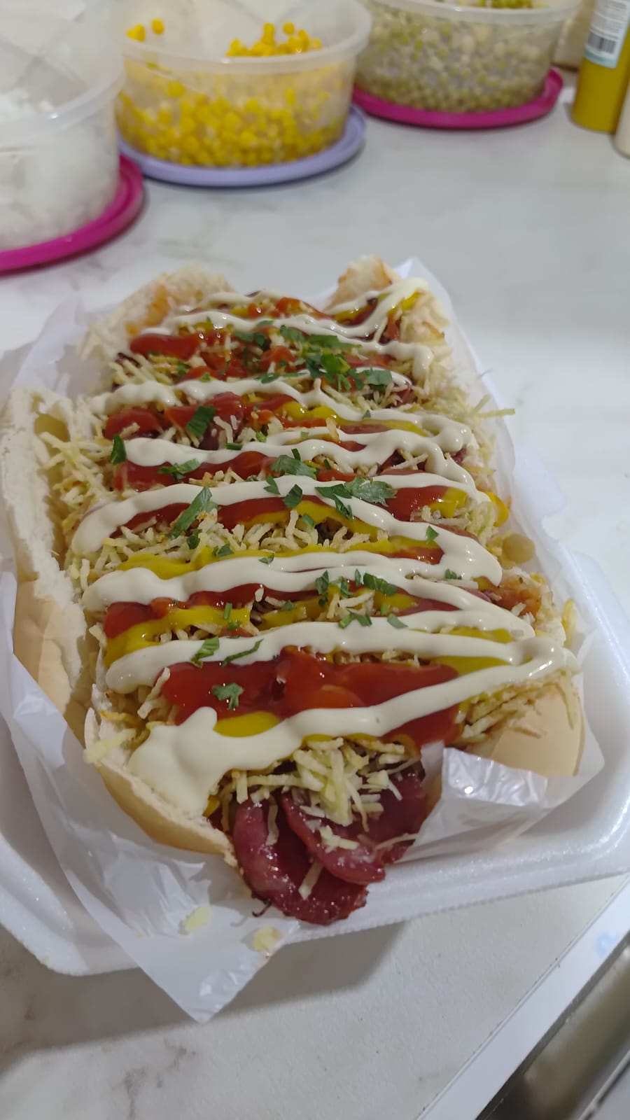 Pão, 2 salsichas, molho, milho, ervilha, tomate, cebola em cubos, batata palha, queijo ralado, ketchup, mostarda, maionese caseira e tempero verde.