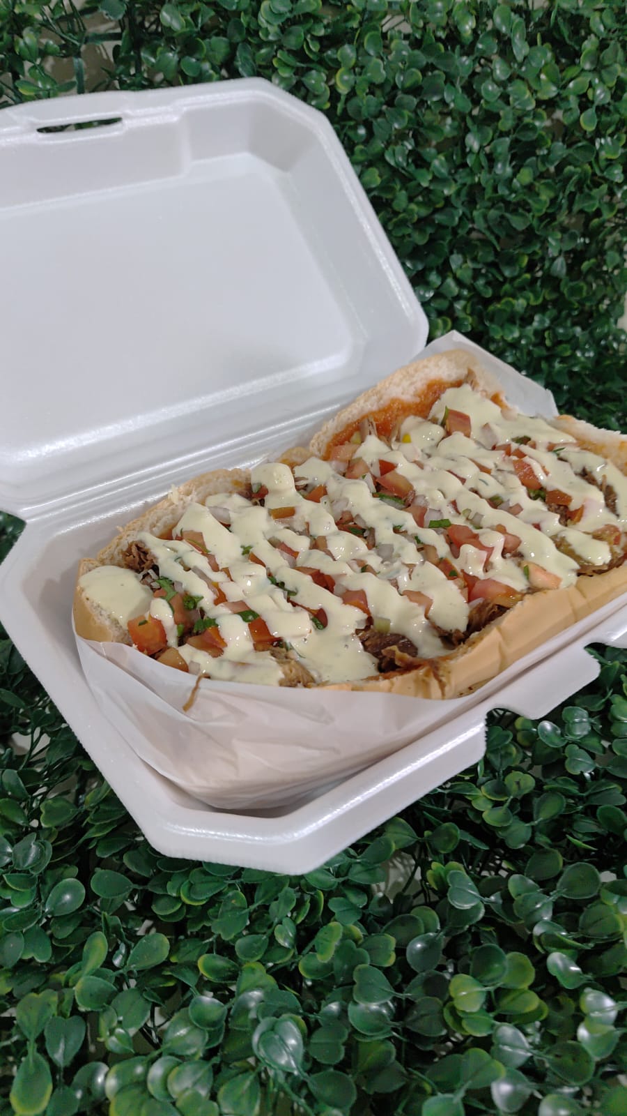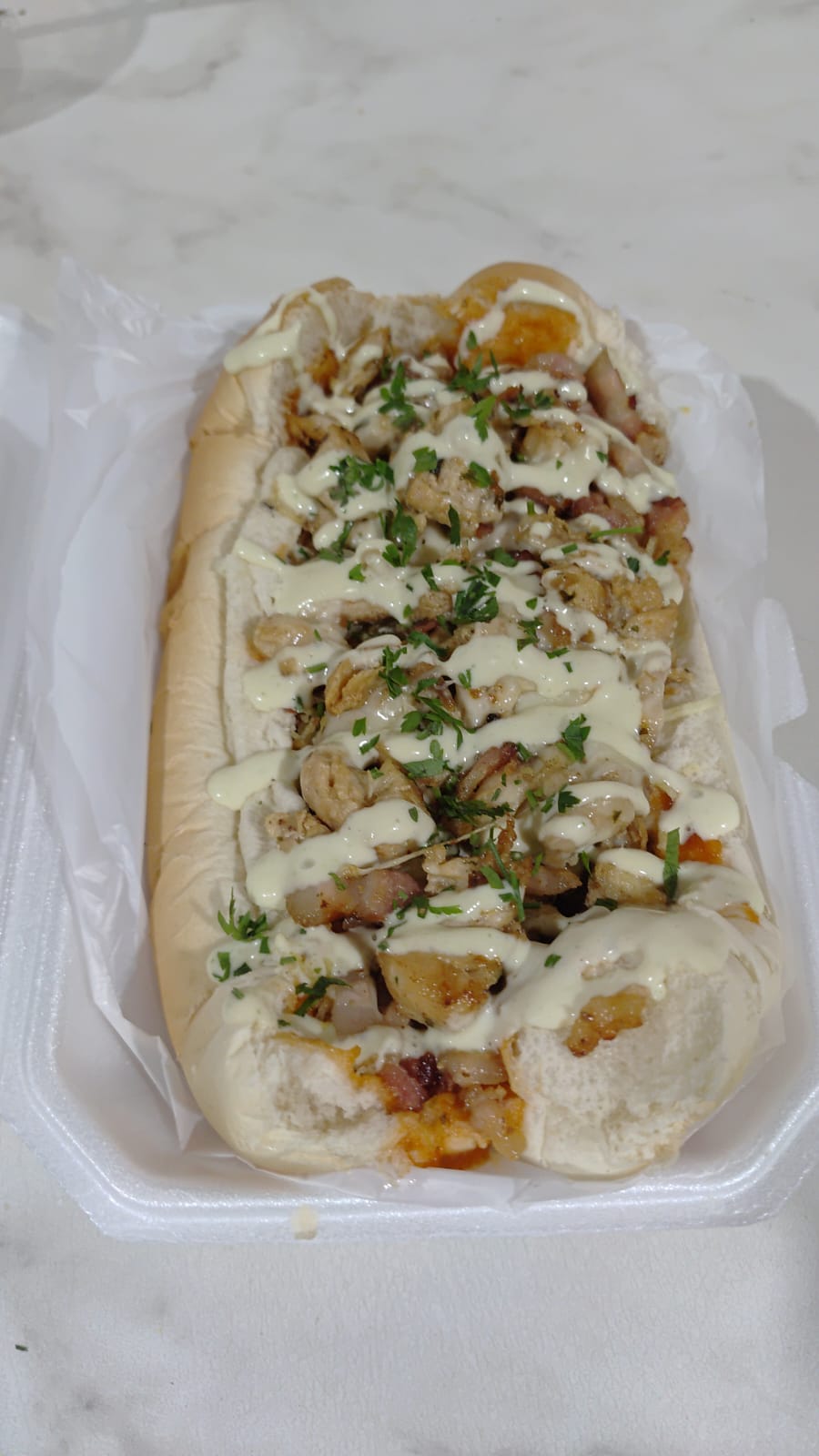 Pão, Coração, Frango, Calabresa, Bacon, molho, milho, ervilha, batata palha, queijo ralado, vinagrete, maionese caseira e tempero verde.